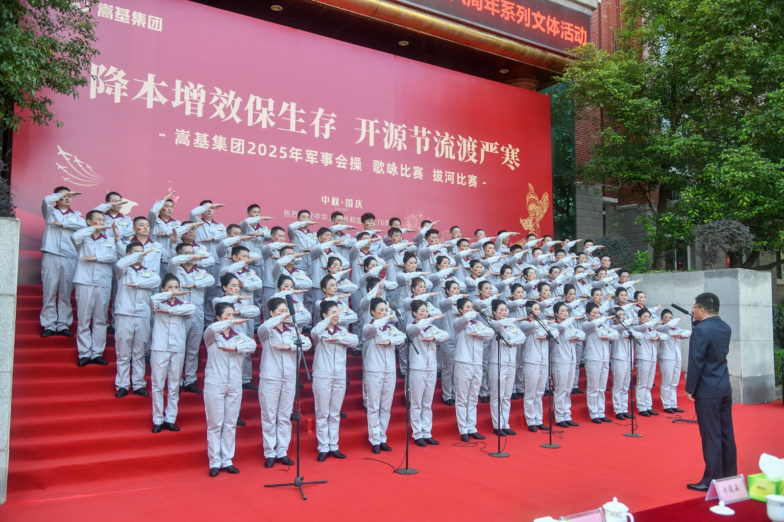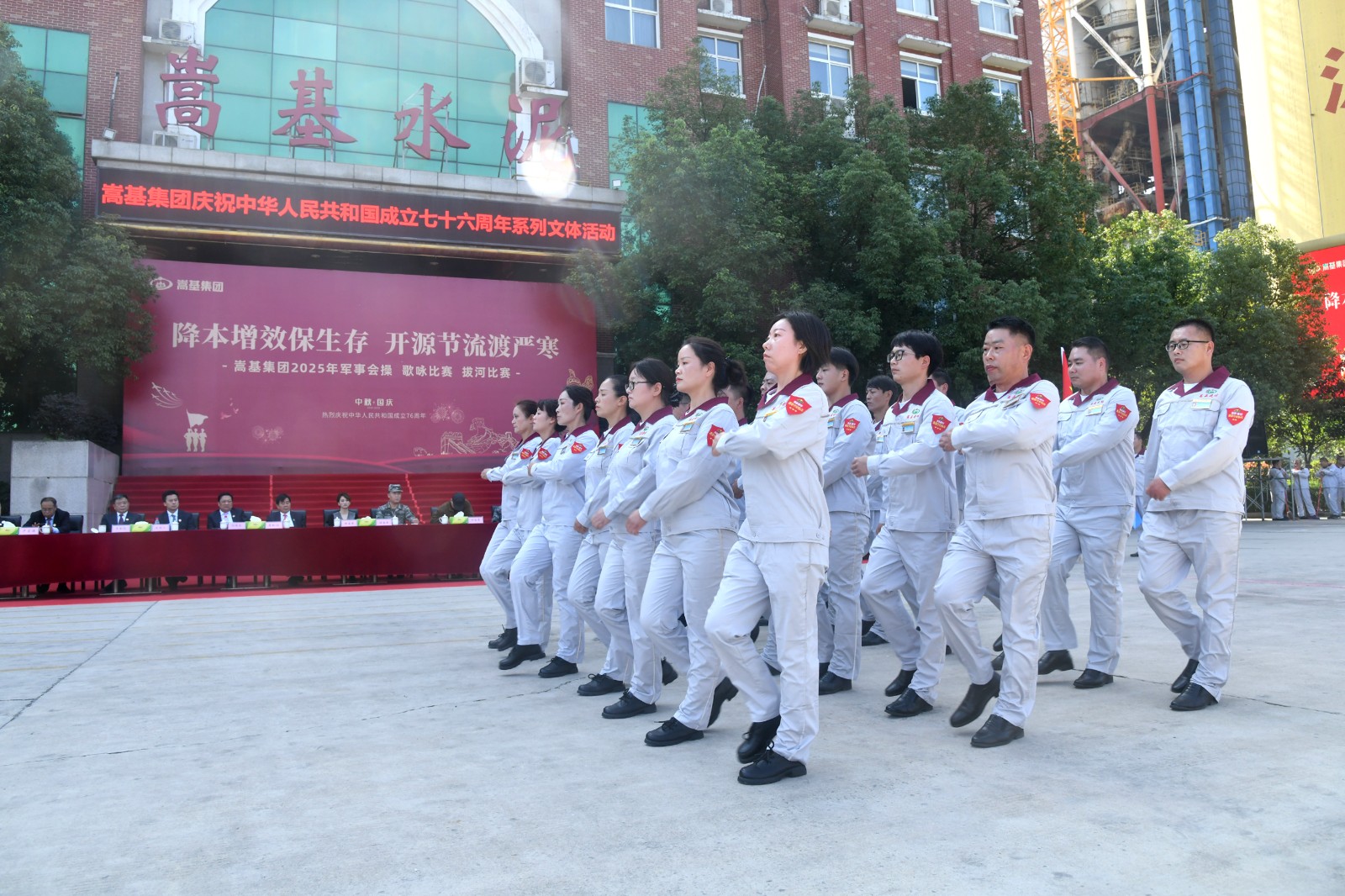 9月30日上午,嵩基集團(tuán)在嵩基水泥迎賓廣場(chǎng)隆重舉辦以“降本增效保生存 開源節(jié)流渡嚴(yán)寒” 為主題的慶祝中華人民共和國(guó)成立76周年軍事會(huì)操、歌詠比賽及拔河比賽系列文體活動(dòng)。此次活動(dòng)旨在喜迎新中國(guó)76周年華誕,凝聚奮進(jìn)力量,展現(xiàn)企業(yè)風(fēng)貌。集團(tuán)公司董事長(zhǎng)屈松記、總經(jīng)理李天義等領(lǐng)導(dǎo)出席活動(dòng),各單位代表隊(duì)及觀摩人員510余人參加。